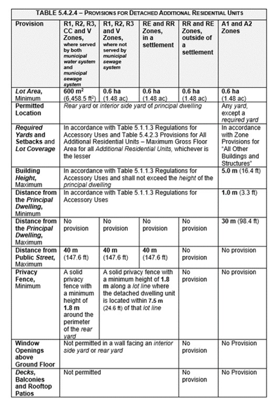 - Note: An additional residential unit in a detached accessory building shall comply with the provisions of Table 5.4.2.3 and Table 5.4.2.4, where a conflict exists, the provisions in Table 5.4.2.4 will prevail.