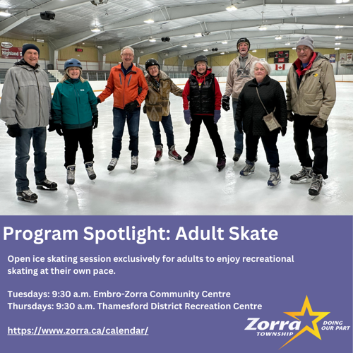 The Township of Zorra is pleased to offer recreational Shinny on a drop-in basis at both Embro and Thamesford Arenas throughout our ice season. Watch our Community Calendar for dates and times.